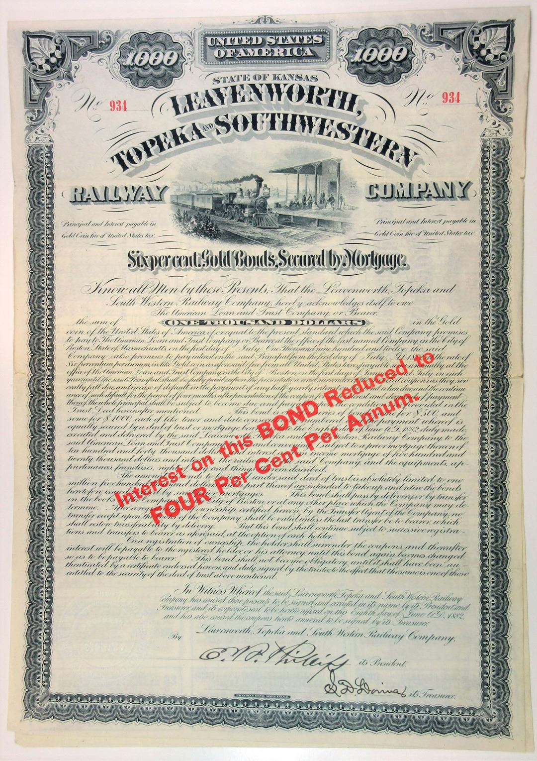 Kansas, 1882, $1000, I/U 6% 2nd Mortgage Gold Coupon Bond, Black without underprint, locomotive arriving at station on top, red overprint with declaration of reduced interest rate. VF condition. Scarce bond. Franklin BNC.