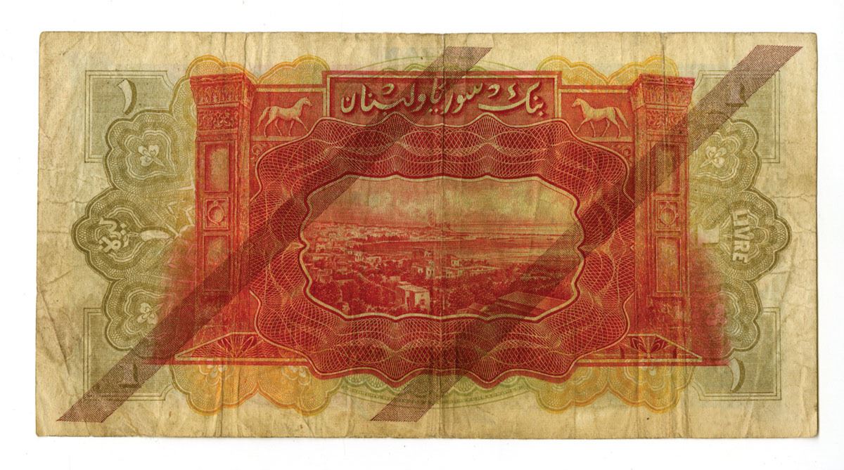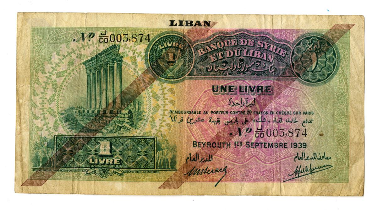 Lebanon, 1939. 1 Livre, P-26b, Issued Banknote, Green on lilac underprint and lilac overprint, Columns of Baalbek at left, Back is red with orange and olive and city view at center, S/N J/CO 003.874, Fine to VF+ condition. BWC.