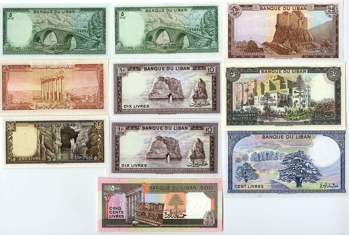 Lebanon, 1952 to 1988. Lot of 10 Issued Banknotes, Includes: Banque de Syrie y du Liban, 1952, 25 Livres, P-58a, TDLR; Banque du Liban, 1980, 1 Livre, P-61c, TDLR; 1986, 5 Livres, P-62d (2), TDLR; 1986, 10 Livres, P-63f (2), TDLR; 1983, 25 Livres, P-64c, TDLR; 1988, 50 Livres, P-65d, TDLR; 1985, 100 Livres, P-66c, TDLR; 1988, 500 Livres, P-68, TDLR. Notes range from AU to Gem Uncirculated condition. (10). Sold "AS IS" no returns accepted.