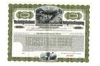 Pennsylvania. $1000 Specimen 4 1/2% Series A Registered Consolidated Mortgage Sinking Fund Gold Bond, Black print on green border and under tint on horizontal format, Photograph of bridge over river at top, Specimen overprints and POC's, VF-XF condition, ABNC.