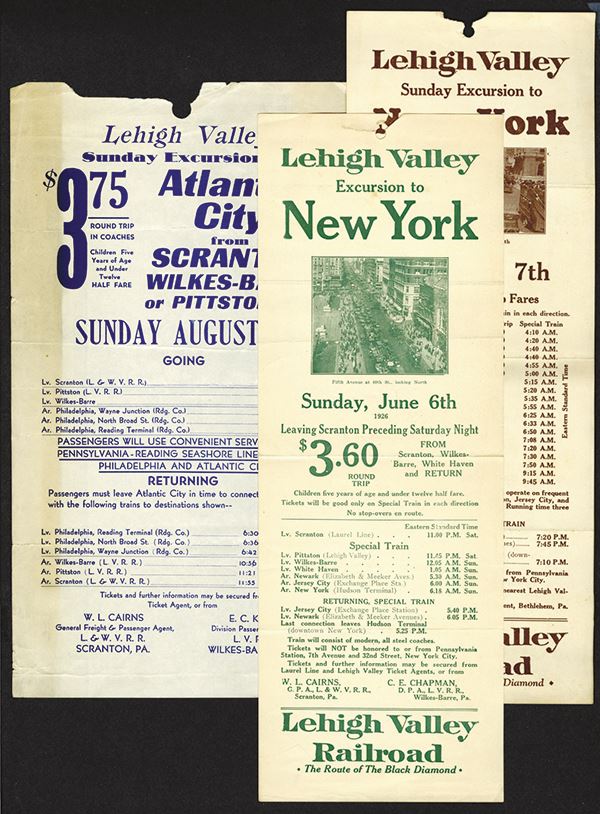 PA. NY. Lehigh Valley Railroad. Advertising excursion pull sheets - New York, Atlantic City. 1926, and two which are not dated. Longest is 14 inches. 3 pieces.