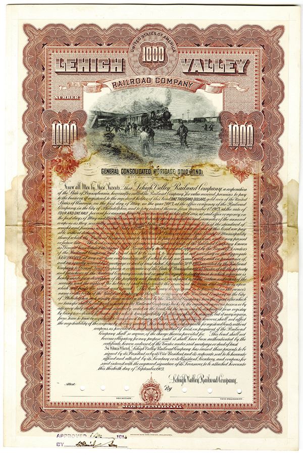 Pennsylvania, 1913. $1000 Approval Proof 4.5% General Consolidated Mortgage Gold Bond printed on thick cardstock, Black text with brown border and undertint, Men at work near passing train at top center. Approval stamp and signature at bottom, Approval stamps on back, POCs. Fine condition with large stain across center, ABNC.
