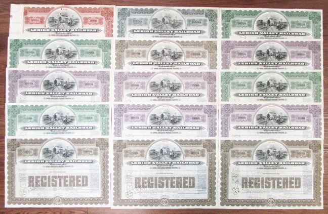 Pennsylvania...., ca.1912-49. Lot of 15, I/C Bonds in various denominations and colors, All pieces have the same vignette of a locomotive passing workers at top, are pin punched cancelled, and are in VF-XF condition. (15). Sold "AS IS" no returns accepted.