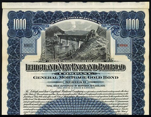 Pennsylvania and New Jersey, 1914, $1000, 5% General Mortgage Gold Specimen Bond Series B, Coupons attached, Railway trestle top center, POC's and red s/n “ 00000” , VF-XF condition, ABNC.