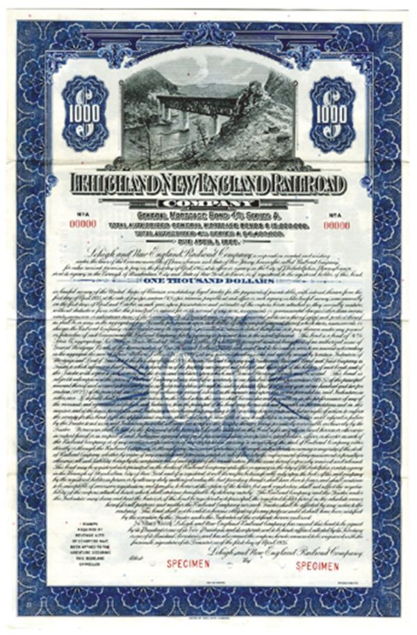 New Jersey & Pennsylvania. $1000 Specimen 4% Series A General Mortgage Coupon Bond, Black print on blue border and under tint, Photograph of bridge over river at top, Specimen overprints and POC's, VF-XF condition, ABNC.