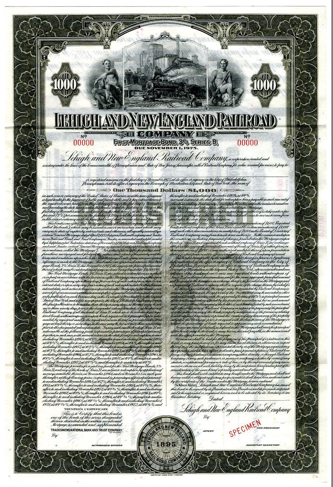 New Jersey & Pennsylvania. $1000 Specimen 3% Series B Registered 1st Mortgage Bond, Black print on dark green border and under tint, Allegorical figures at top flanking image of locomotive outside a large factory, Specimen overprints and POC's, VF-XF condition, ABNC.