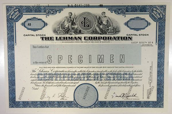 New York (Incorporated in Maryland), Not More Than 100,000 Shares, Specimen Stock certificate, Capital Stock, Black on blue border and underprint, Allegorical men flank Lehman Letter Logo, Lehman Corporation was formed in 1929. On September 15, 2008, the firm filed for Chapter 11 bankruptcy protection following the massive exodus of most of its clients, drastic losses in its stock, and devaluation of its assets by credit rating agencies. The filing marked the largest bankruptcy in U.S. history and is thought to have played a major role in the unfolding of the late-2008 global financial crisis. Rare Specimen certificate from this historic Investment company. ABNC.