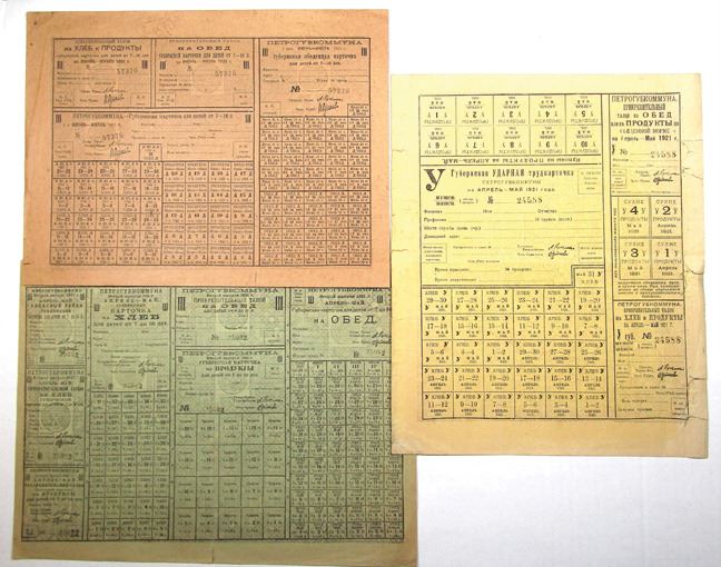 Leningrad, Russia...., 1921. Lot of 3 Full Sheets of Ration Coupons for the periods of April-May 1921 (2) and June-July of 1921. Sheets have specific coupons for specific items, for example there are bread coupons, grocery coupons, dry food coupons, and lunch coupons, Each sheet has a S/N associated with it: 25082, 57376, & 24588. Sheets are in VF to XF condition with one sheet having tears along right side margin. (3). Sold "AS IS" no returns accepted.