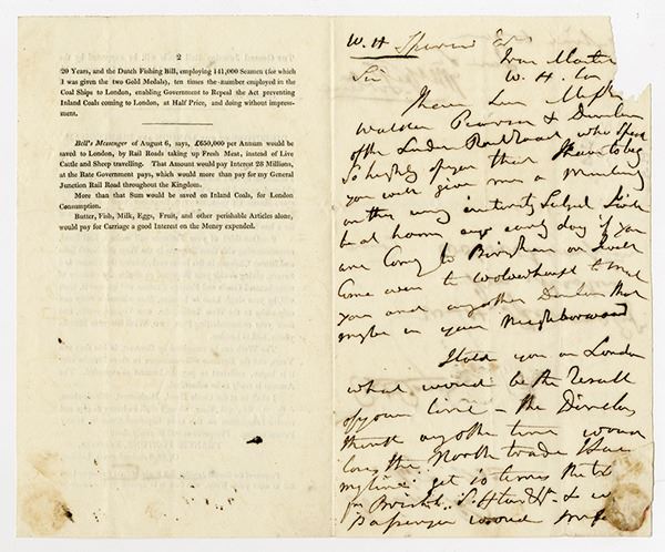 Great Britain.... A 2-page printed open letter by construction engineer Francis Fortune to the directors of the London and Birmingham Railroad, 1832, containing Francis Fortune proposal for linking parts of England by rail, stating that he can build a railroad communicating with the three seaports in the West, North Seas and British Channel. Very good, and an incredibly early and historic railroad item. (John E. Herzog Collection)