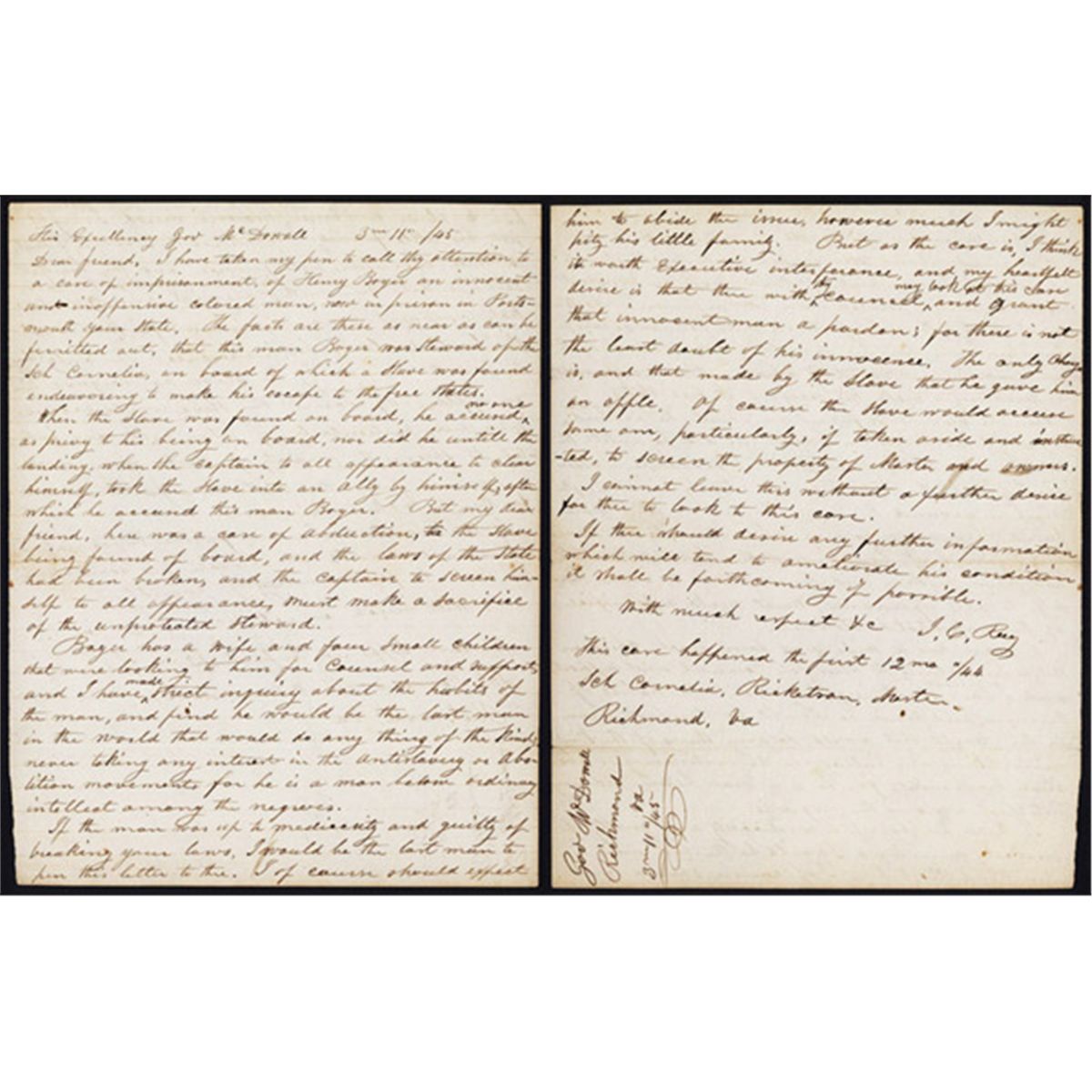 Richmond, Virginia, November 11, 1845, Manuscript 2 page letter from J.C. Rey to the governor of Virginia, Governor Mc Dowall. Vf condition with light foxing, 7.5 by 9.8 inches, A black ship steward, Henry Boyer, who was not a slave, was accused of helping a slave escape from the schooner Cornelia and was imprisoned for this in Virginia. The letter pleads with the governor to release him due to his innocence and that he was a married man with 4 young children, and he would never have broken the law or had any interest in anti-slavery or abolitionist movements and was a man of “below ordinary intellect among the negroes “. Rare and interesting slavery related letter.