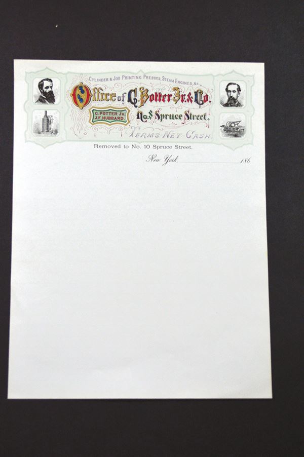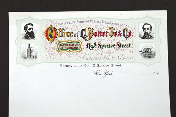 New York. Colorful and ornate letterhead. Job Printer. 10 Spruce St. 186x. Ruled stock.