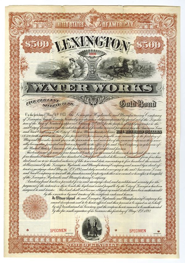 Kentucky, 1893, $1,000. 5% sinking fund gold bond. Brown border with wild horses on right, allegorical woman pouring water jug on left and two men on bottom holding hands. ABNCO. Litho specimen, w/coupons, Fine with archivally reinforced splitting at margins and some folds, rare bond with only 3 found in the ABN archives, Scarce and attractive large sized bond.