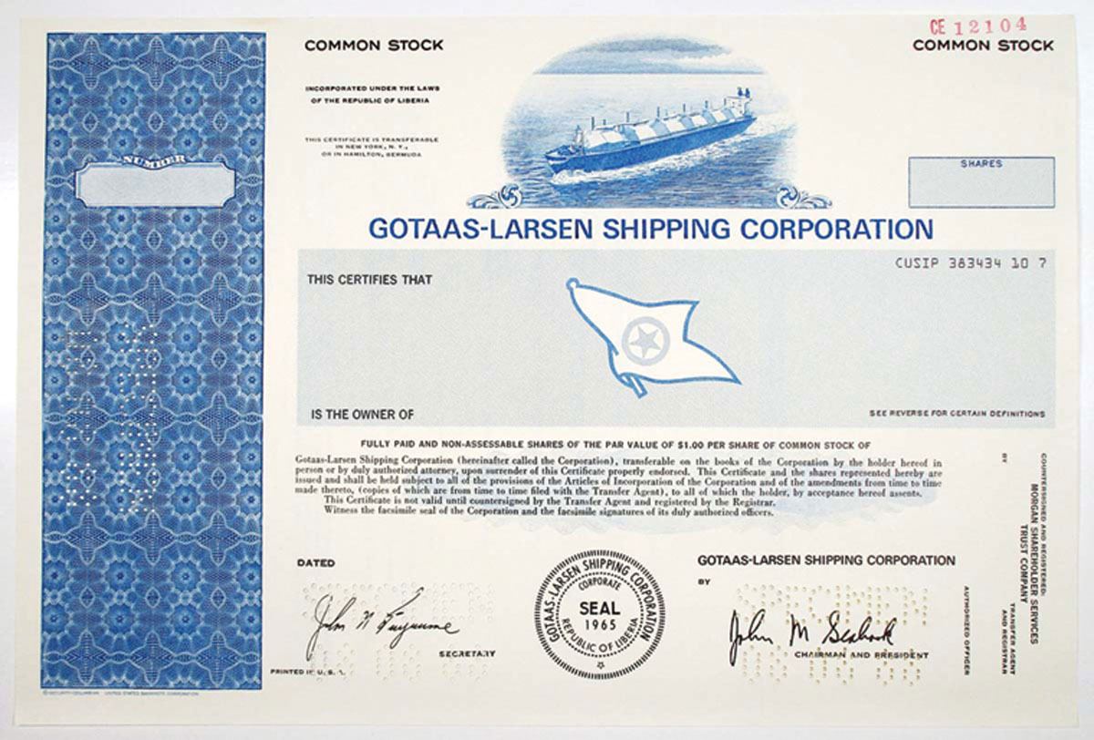 Liberia. Gotaas-Larsen Shipping Corp., 1988 Odd Shares Specimen Stock Cert