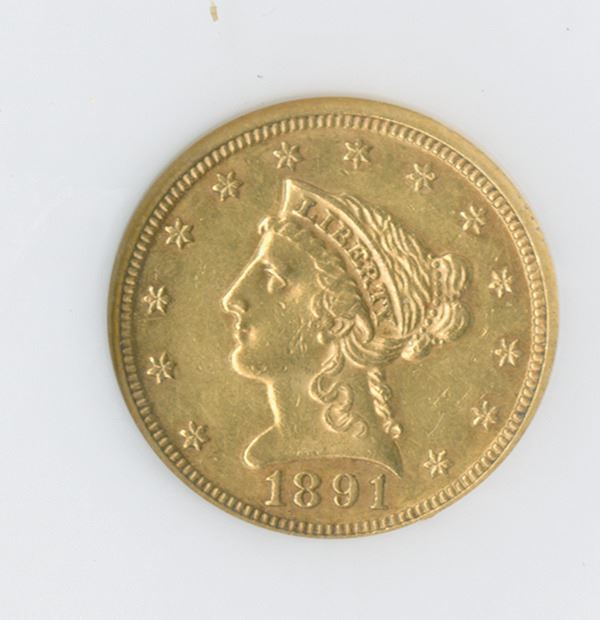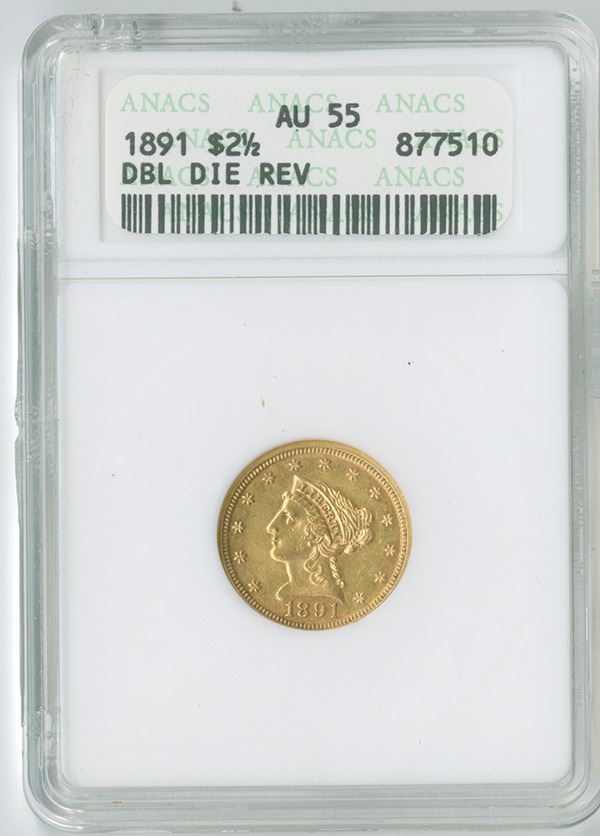 Liberty $2.50, 1891, Double die Reverse, gold, ANA graded AU55, double die reverse, Slab# 877510