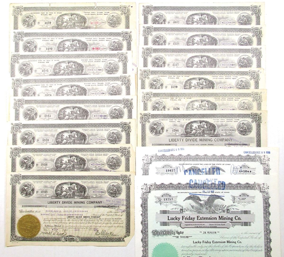 Idaho & Nevada......, 1927-87. Lot of 15 Stock Certificates: ID, 1980s, I/C. Lucky Friday Extension Mining Co. (2); and, NV, 1928 & 1929 Liberty Divide Mining Co. Certificates, I/U, range from VF to XF condition. (13). (15 certificates total in the lot), Sold "AS IS" no returns accepted.