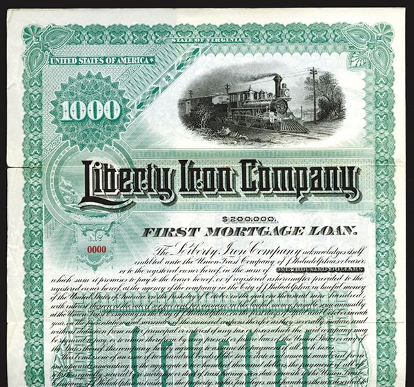 Virginia, 1890, $1000 1st Mortgage 6% Specimen Bond, Black printing with green border and underprint, Moving locomotive by telegraph lines top center, POC's and red SPECIMEN overprints, VF condition, ABNC.