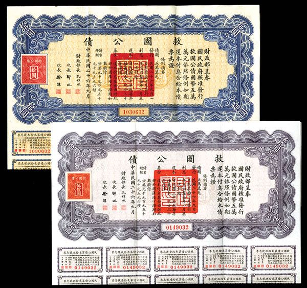 China. Lot of 2 issued and uncancelled bonds, Includes $10, with 32 coupons and $50, with 33 coupons, both VF, attractive Chinese bonds.