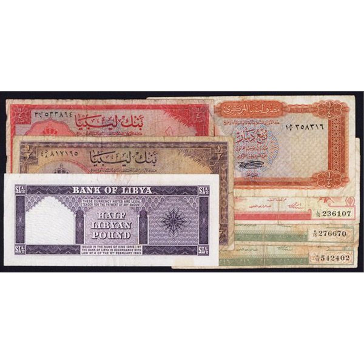 Libya, Lot of 7 notes, Includes United kingdom of Libya trio, P-5 and P-6; and Bank of Libya, P-23a; P-24, P-29 and P-33a. Condition varies from VG to VF. Inspection recommended. Sold “AS IS”.