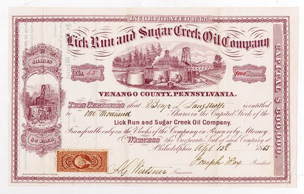 Venango County, PA. (Offices in Philadelphia), 1000 Shares, I/U Stock Certificate, Purple printing, Oil well with oil workers, tanks and barrels, large counterfoil on left with oil well and workers, 25cts USIR Adhesive Revenue stamp. S/N 65, XF condition.