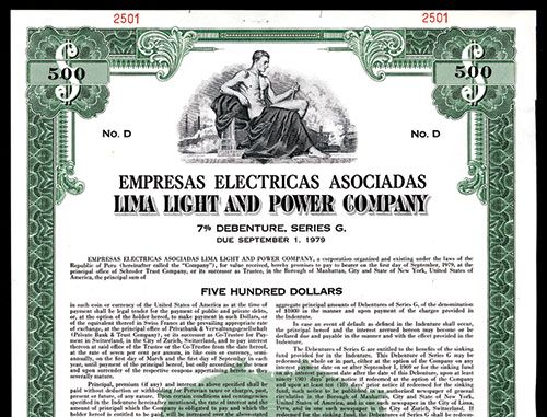 Peru, 1964, $500, 7% Series G Specimen Bond, Vertical fomrat, Black on green border and underprint, Allegorical man sitting top center, Red SPECIMEN overprints and POC's, VF-XF condition, SCBNC.