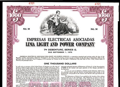 Peru, 1964, $1000, 7% Series G Specimen Bond, Vertical format, Black on green border and underprint, Allegorical man sitting top center, Red SPECIMEN overprints and POC's, VF-XF condition, SCBNC.