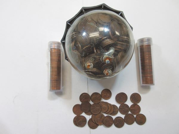 BU roll of 1937-D Lincolns; BU roll of 1939 Lincolns. Also included is a "SAVE FOR A RAINY DAY BANK" about the size of a soft ball, filled with Wheat Cents. Please inspect, sold "As is" No returns accepted.