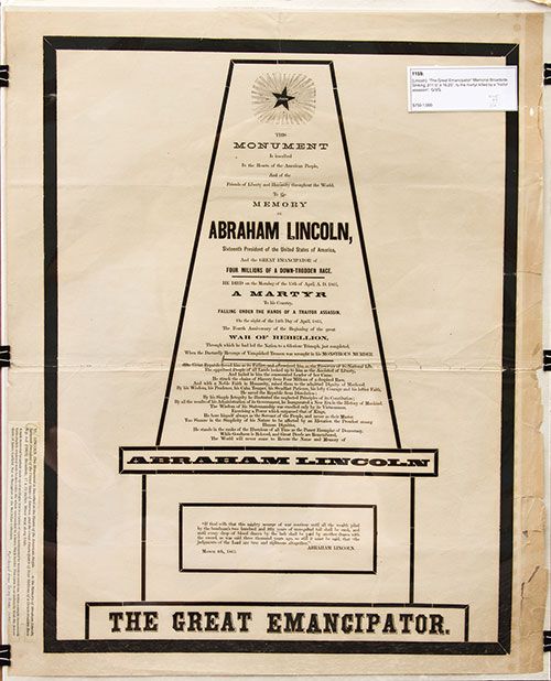 Lincoln: This Monument is Inscribed in the Hearts of the American Peopleā¦to the Memory of Abraham Lincoln, Sixteenth President of the United States of America, and the Great Emancipator of Four Millions of a Down-trodden Race. No place, no date, [ca.1865?] Broadside, 17x23. Minor wear along folds, and edge wear. With several splits. Suitable for framing and a fine piece during the 150th anniversary of the Emancipation Proclamation. A stark memorial broadside made up of an elegiac text in a variety of types surmounted by a woodcut Union Star within a simple monumental form rendered with rules, the whole surrounded by a heavy black border. From the descendants of James Garfield. Not in Monaghan or the McClellan Collection. Rare and historic document.