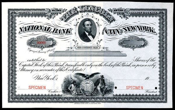 19xx. Odd Shs., Specimen Stock, Black border with Abraham Lincoln portrait in middle, arms of NY at bottom, ornate, very attractive and rare, POC's, XF condition. ABNC.