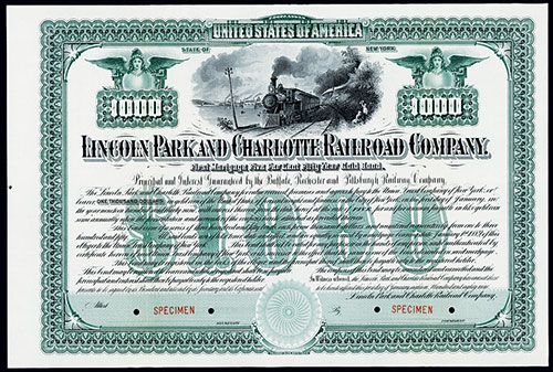 New York, $1000, 5% 1st Mortgage 50 Year Gold Specimen Bond, Horizontal format, Black print on green border and underprint, Moving locomotive top center, POC's, VF-XF condition, FBNC.