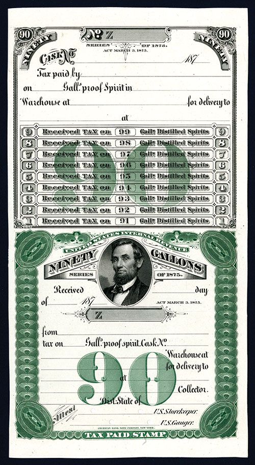 U.S., Act of March 3rd, 1875, 187x. Proof printed on india paper on cut down card. Bottom has green border and undertint with vignette of Abraham Lincoln. The top is the counterfoil that has lines for payment of tax information. POC's. Choice uncirculated condition. Rare as proof.