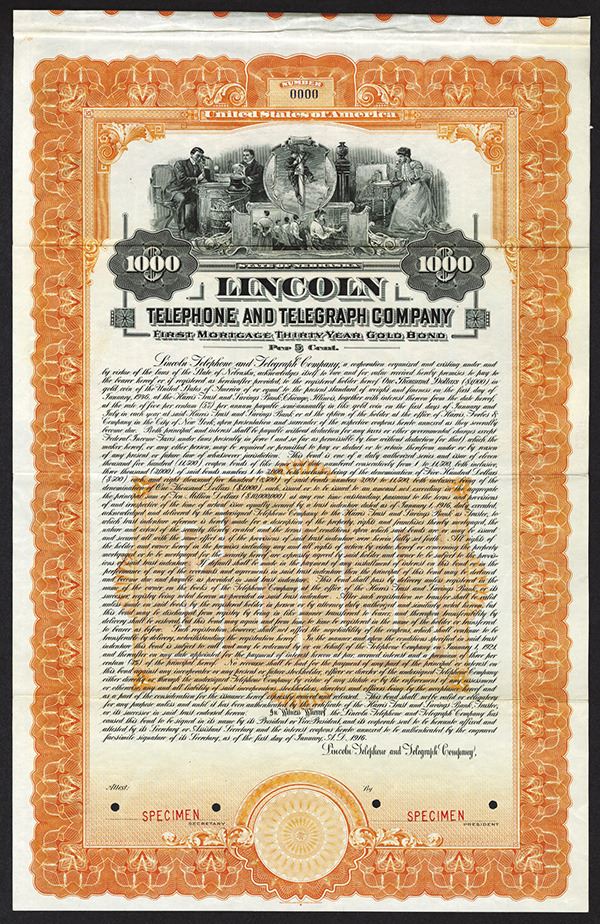 Nebraska, $1000, Specimen 1st Mortgage 5% Gold Bond. Orange border. POC's and "00000" serial numbers. Coupons attached. XF condition. Rare and attractive telegraph bond.