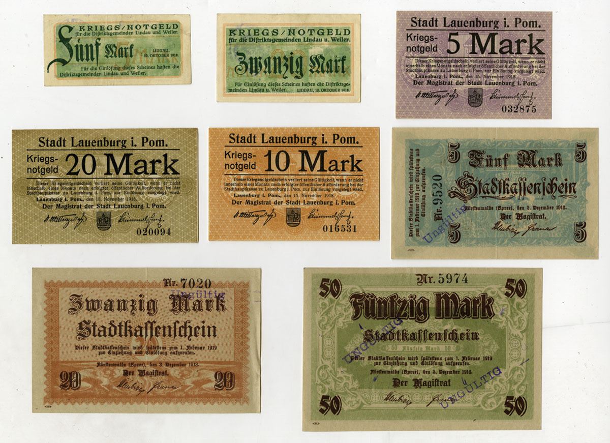 Germany, 1918-19. Lot of 8 Issued Notgeld, Includes: Lindau/Weiler 5 Mark and 10 Mark; Lauenburg 5 Mark, 10 Mark, and 20 Mark; and Fürstenwalde 5 Mark, 20 Mark, and 50 Mark. Notes range from VF to XF condition. (8). Sold "AS IS" no returns accepted.
