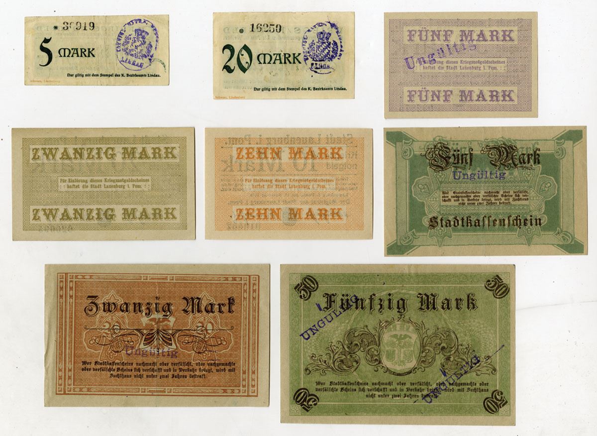 Germany, 1918-19. Lot of 8 Issued Notgeld, Includes: Lindau/Weiler 5 Mark and 10 Mark; Lauenburg 5 Mark, 10 Mark, and 20 Mark; and Fürstenwalde 5 Mark, 20 Mark, and 50 Mark. Notes range from VF to XF condition. (8). Sold "AS IS" no returns accepted.