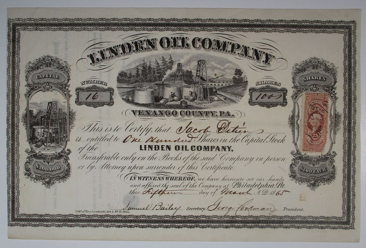 Warren County, PA., 1865, 100 Shares, I/U stock certificate, Black without underprint, Oil wells, tanks, barrels workers in middle and oil well at left, S/N 16, VF condition, 25ct adhesive 1st issue revenue stamp on right, Scarce oil certificate, Lith of Theo. Leonhardt.