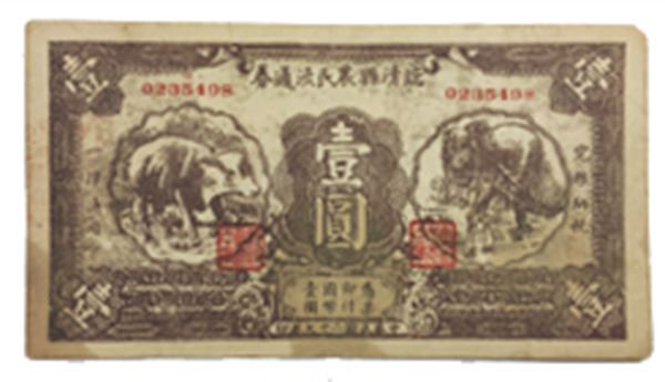 Shandong Province, China. A local temporary currency issued by Linqing County, Shandong Province in 1938. Interestingly the main images of the front side (cattle and donkey) are copied from the back sides of The Farmers Bank of China 5 and 10 yuan 1935, and the biggest "1 yuan" denomination is copied from 1 yuan 1935 of the same bank. The serial number is 0235498. The two seals are from "farmer representative" and "manager assistant", which are uncommon. The texts on the sides mean "good for all debts". The back side shows regulations indicating that this is a temporary measure for the shortage of official currency. The bottom side also shows the printer's name. ______________1938__________________________________________________________Ò__Ó_________________________________Ò______Ó_Ò______Ó_____________________________________
