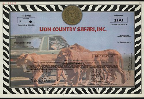 Delaware, 1978, 100 Shares, Specimen Stock, Zebra borders with company name in red print and gold lion seal top center, Photo of three lions approaching car, VF-XF condition, SCBNC.