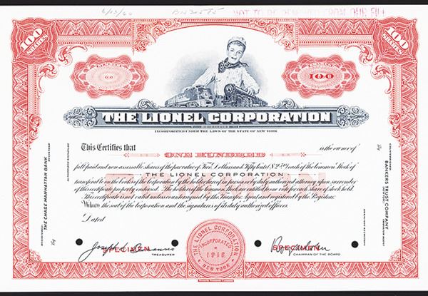 New York. 100 Shares Common Stock Specimen Certificate, Black print on red border and under tint, Child playing with trains at top, Specimen overprints and POC's, VF-XF condition, SBNC. Rare as specimen.