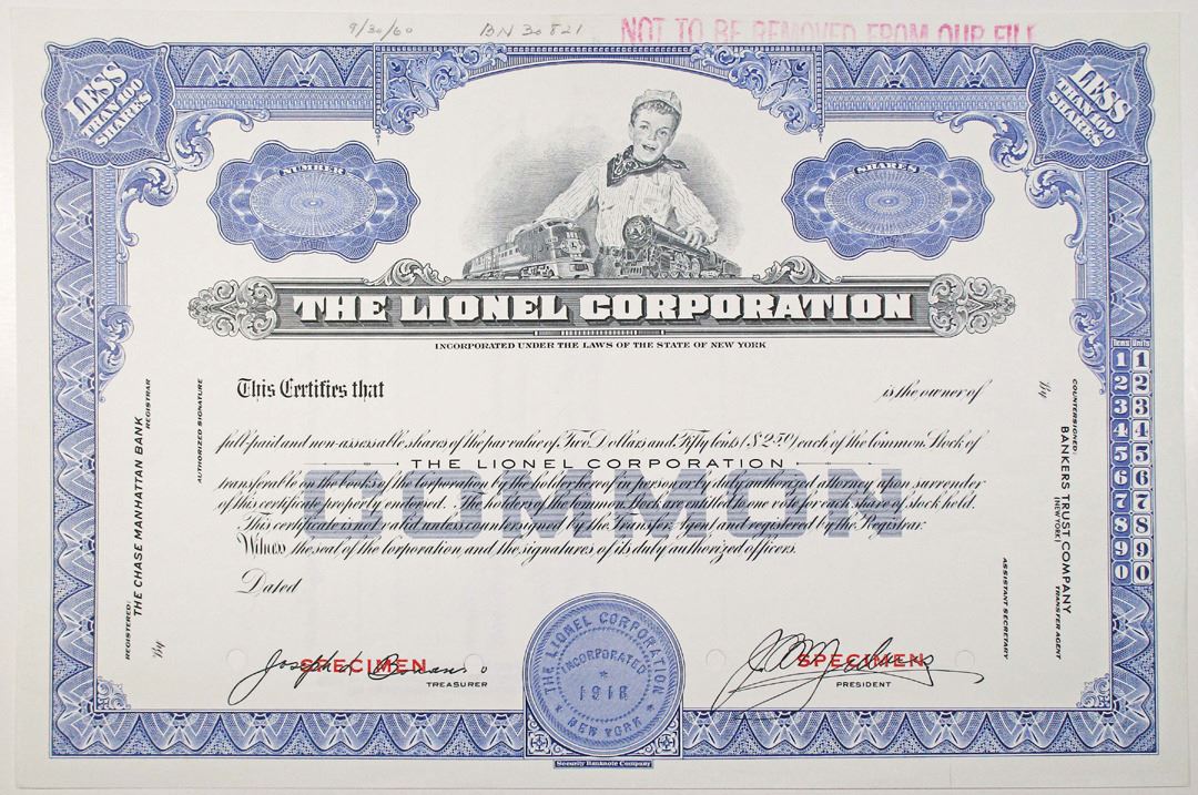 New York, 1960. <100 Shares Specimen Stock Certificate, Black text with blue border and underprint, Allegorical boy playing with trains at top center. Red specimen overprints, POCs, Do not remove stamp at top margin. VF condition, SBN. Lionel, LLC is an American designer and importer of toy trains and model railroads.