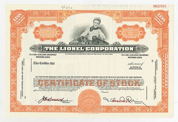 New York. <100 Shares 3 3/4% Non-Cumulative Convertible Preferred Stock Specimen Certificate, Black print on orange border and under tint, Little boy at top dressed as train conductor playing with toy trains, Specimen overprints and POC's, VF-XF condition, S-CBNC.