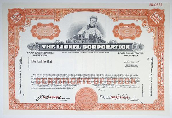 New York, ND (1950-1960s). Specimen <100 Shares, 3 3/4% Non-Cumulative Convertible Preferred Stock Certificate, Black text with orange border and underprint, Boy at top plays with a pair of trains. Red specimen overprints, POCs, XF condition, SCBN. Lionel Corporation was an American toy manufacturer and holding company of retailers that has been in business for over 120 years. It was founded as an electrical novelties company, Lionel specialized in various products throughout its existence. Toy trains and model railroads were its main claim to fame. Lionel trains have been produced since 1900, and their trains drew admiration from model railroaders around the world for the solidity of their construction and the authenticity of their detail. During its peak years in the 1950s, the company sold $25 million worth of trains per year. In 2006, Lionel's electric train became the first electric toy inducted into the National Toy Hall of Fame. In 1969, the sold their model train lines to General Mills, but continued to operate until 1993 as a holding company for their toy stores. Its model trains are still in production as a separate company.