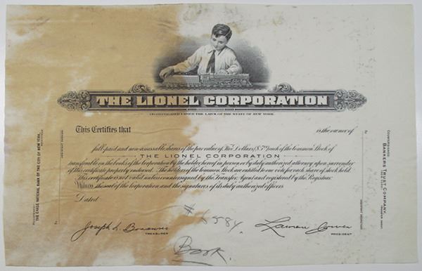 New York, ND (1930-50s). Odd Shares Progress Proof Stock Certificate, Black text, Boy playing with toy trains at top center. Fine condition with stain across left side, some writing in black ink at bottom. Lionel Corporation was an American toy manufacturer and holding company of retailers that has been in business for over 120 years. RBNC