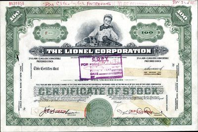 Lionel Corp. ca.1960-63. 100; <100 Shs. 2 different production department specimen stocks used as models. Additions are taped onto certificates including changes of text and signatures and both have archival notations and markings. Famous vignette of young boy with engineers hat playing with toy electric trains. Also includes photo proof of text, vignette and title and correspondence relating to production of the certificates. Unique in archive. SCBNC.
