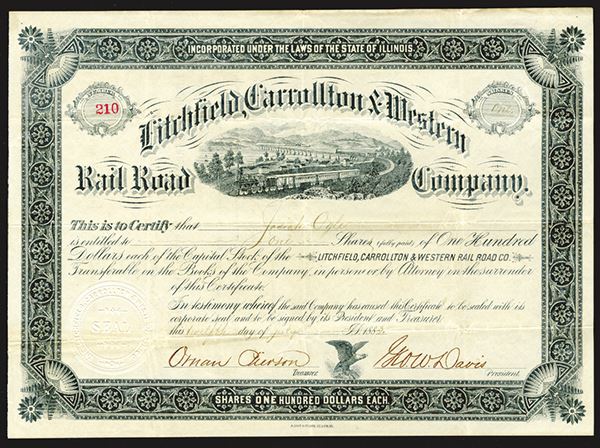 Illinois. Ornate black border, trains, river, mountains, #210, IU, VF+. Rare! You may never see another.