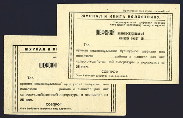 Russia (USSR), pair of unissued (though one with a handstamp impression) local notes, 25 Kopeks each, to be used towards any subscriptions with literatures and periodicals on agricultural work. Has a blank space "Comrade ________" where the name of the recipient would be written. Issued by the SOVPROF (Soviet Labor Union) Society of Village Workers Patronage. Unusual and choice AU (due to handling).