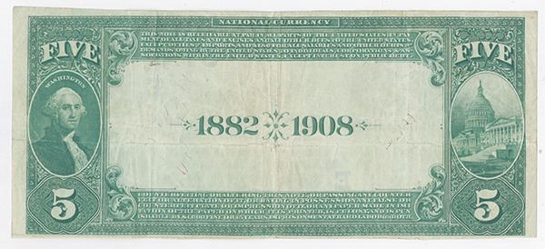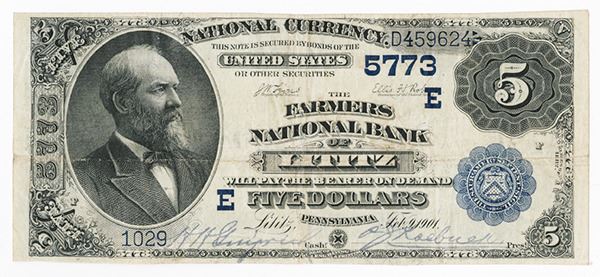 Lititz, PA. $5, 1882 DB, S/N D459624 - 1029, Lyons | Roberts Signatures, VF condition with 4 ample to large margins, sharp corners, bright colors and firm paper body. 17 large size notes are known on this bank, this is a $5 DB denomination that is new to the census and previously unreported for this variety in Track & Price with no examples appearing at auction over the last 20 years. Rare and desirable New Jersey National Banknote.