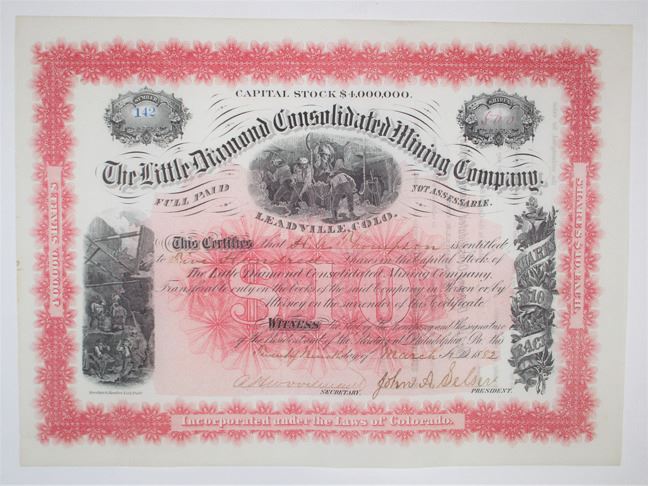 Leadville, Colorado. 500 Shares, I/U, Black on red undertint and border with miners in middle and lower left, S/N 142, XF, very attractive and scarce stock certificate.