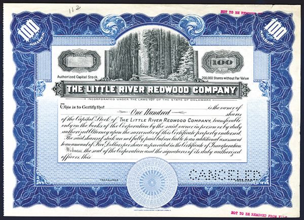 Delaware, 19xx, (ca. 1900-1910), 100 Shares, Specimen Stock, Black on blue border and underprint, Vignette of road through the Redwood forest top center, VF-XF condition, SBNC.