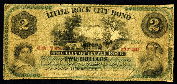 Little Rock, AR, $2, Issued banknote, Black with green border and undertint, wear in middle vignette, VG to Choice VG condition. NBNC.