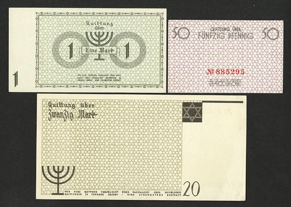 Lodz (renamed Litzmannstadt), 1940 Lot of 3 notes, Includes 50 Pfennig; 1 Mark; and 20 Marks, different sizes and colors, Scarce and historic Judaica notes. Lodz was the key industrial city that contained, after Warsaw, the second largest Jewish community in pre-war Poland. Lodz was occupied by the German Army in 1939 1 week after the German's invaded Poland and renamed Litzmannstadt. In February 1940 the Germans ordered the establishment of a ghetto in the northeastern section of Lodz. Over 150,000 Jews, more than a third of the total population of Lodz, were forced into a small area of the city. In January 1942 through 1944 deportations continued from the Lodz Ghetto to the Chelmno extermination complex. By August 1944 few Jews were left in Lodz.