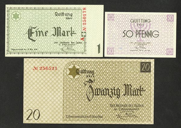 Lodz (renamed Litzmannstadt), 1940 Lot of 3 notes, Includes 50 Pfennig; 1 Mark; and 20 Marks, different sizes and colors, Scarce and historic Judaica notes. Lodz was the key industrial city that contained, after Warsaw, the second largest Jewish community in pre-war Poland. Lodz was occupied by the German Army in 1939 1 week after the German's invaded Poland and renamed Litzmannstadt. In February 1940 the Germans ordered the establishment of a ghetto in the northeastern section of Lodz. Over 150,000 Jews, more than a third of the total population of Lodz, were forced into a small area of the city. In January 1942 through 1944 deportations continued from the Lodz Ghetto to the Chelmno extermination complex. By August 1944 few Jews were left in Lodz.